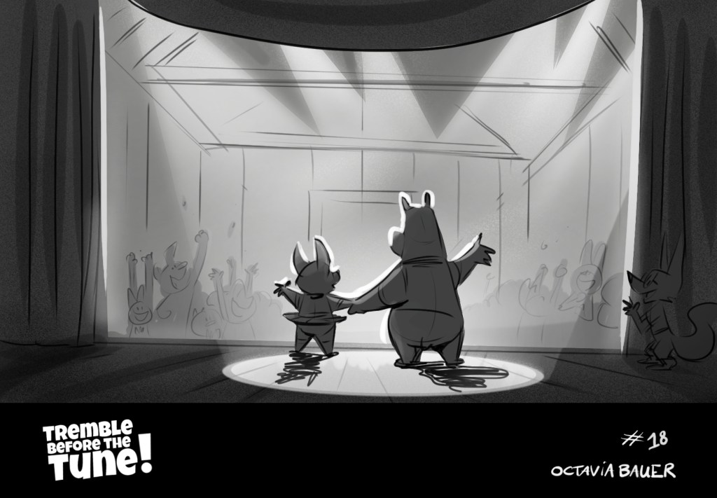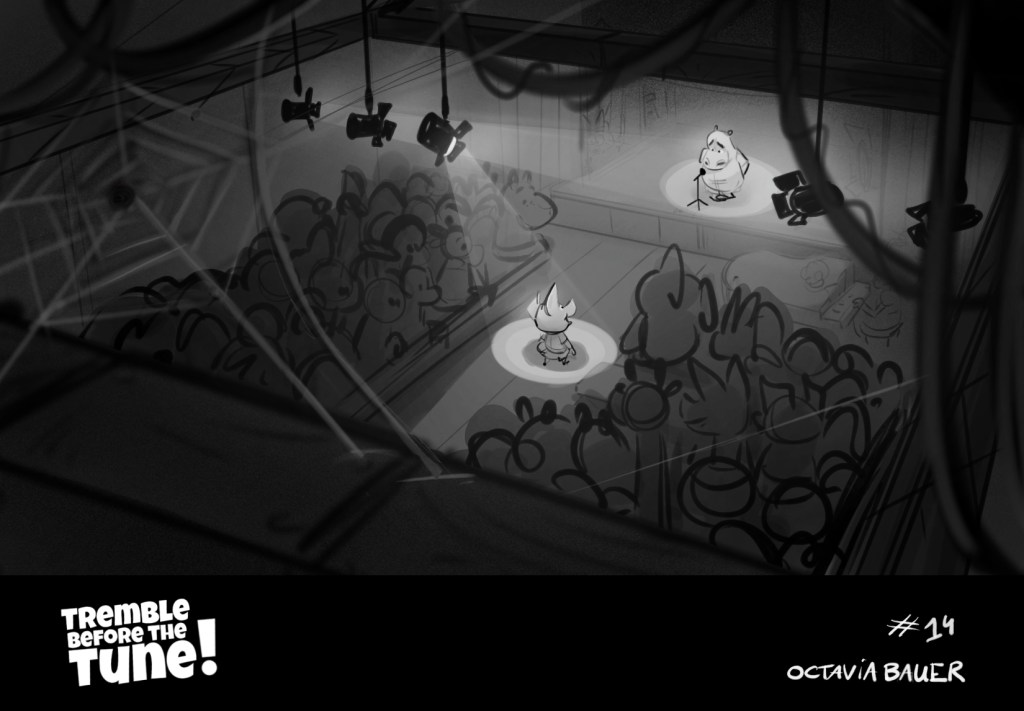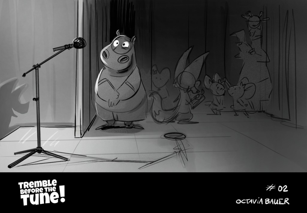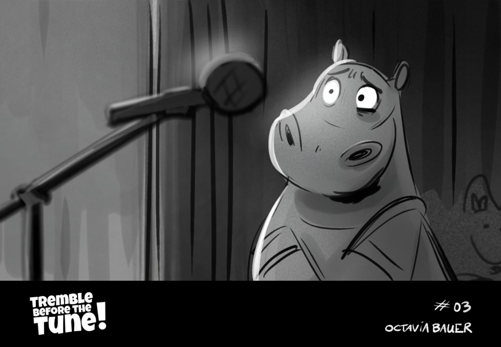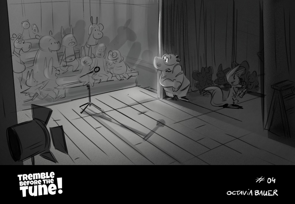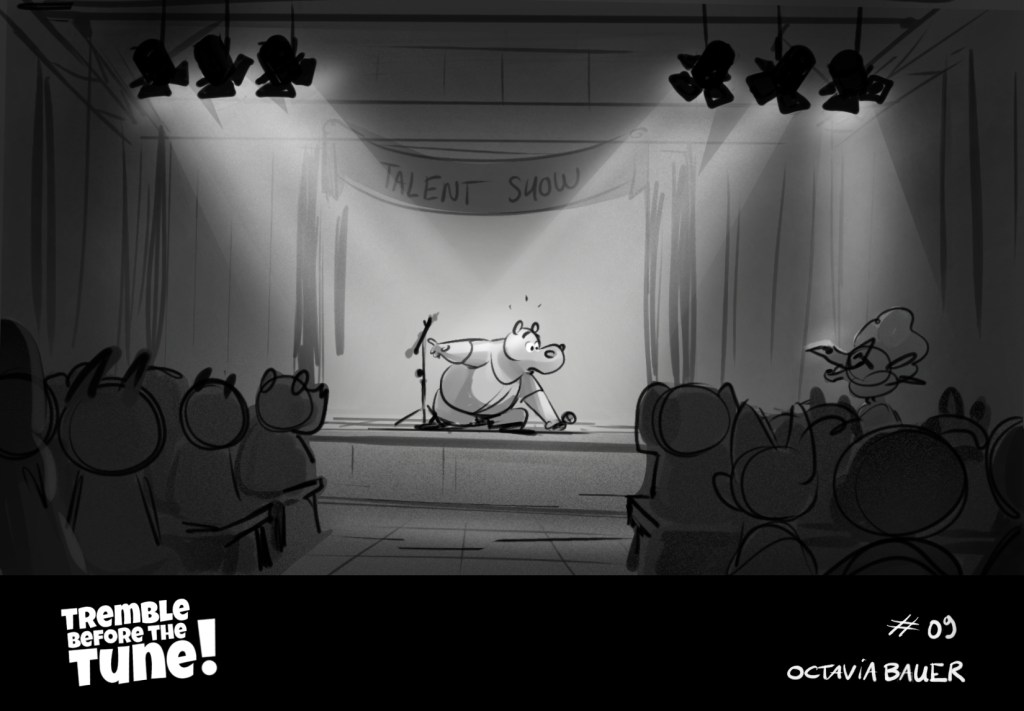 A beatboard from a script, made for training purposes. « It’s the collège talent show, W. have to sing on stage, the only problem: he has stage fright. » (click and slide to read